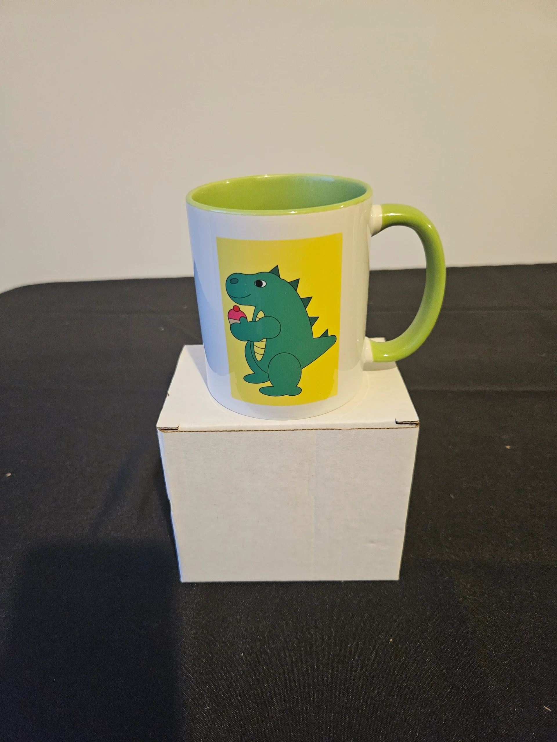 Mug, Green colour, with theme print picture of a Dinosaur.