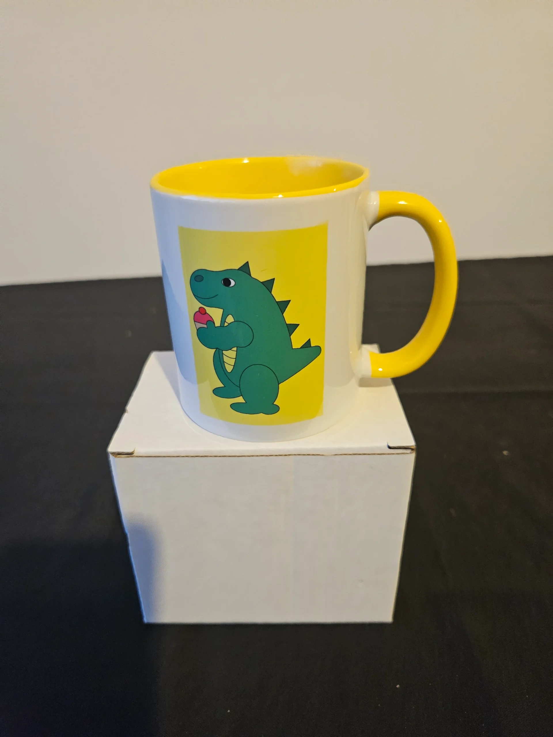 Mug, yellow colour, with theme print picture of a Dinosaur.