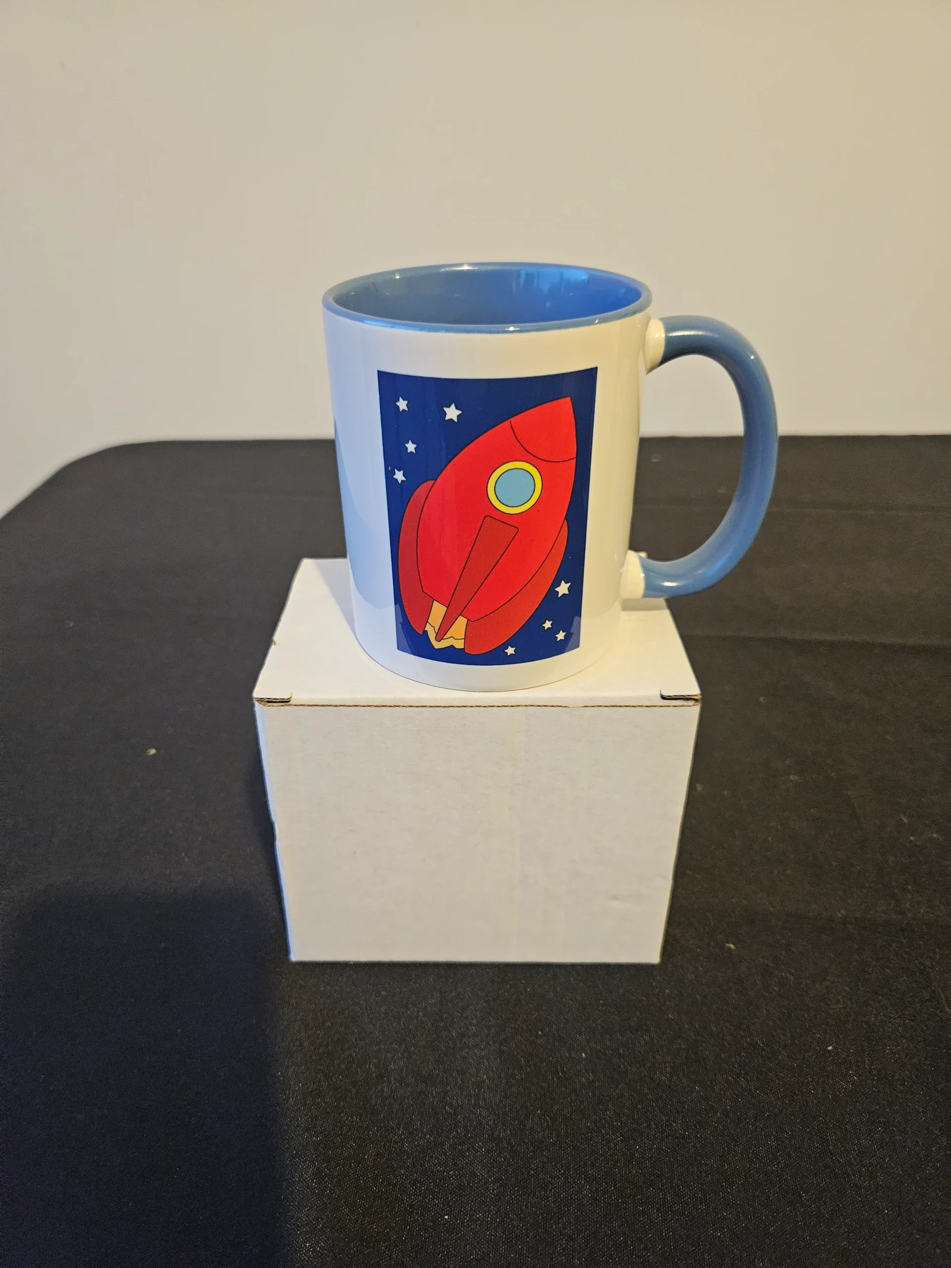 Mug, blue colour, with theme print picture of a Rocket.
