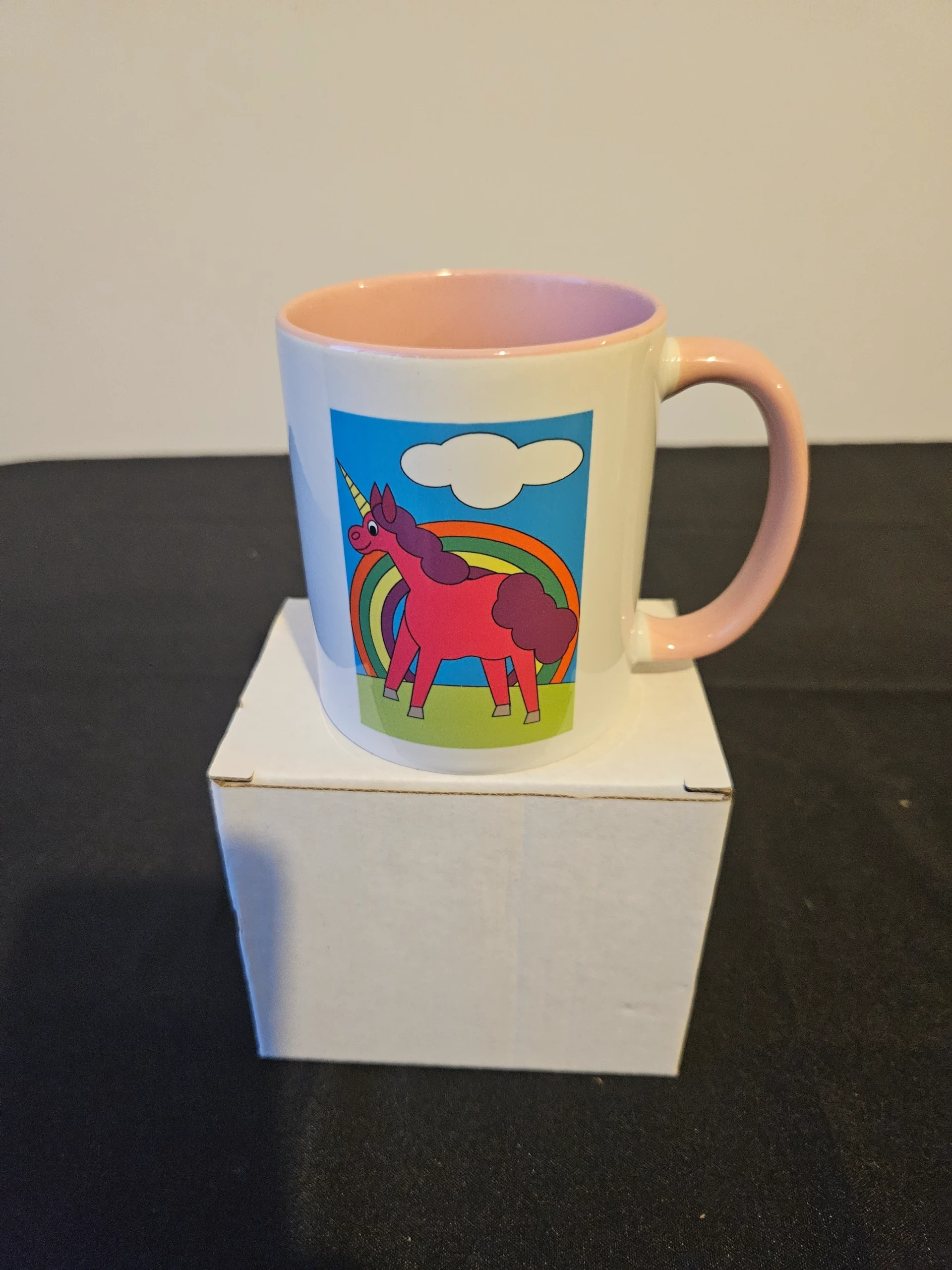 Mug, Pink colour, with theme print picture of a Unicorn.